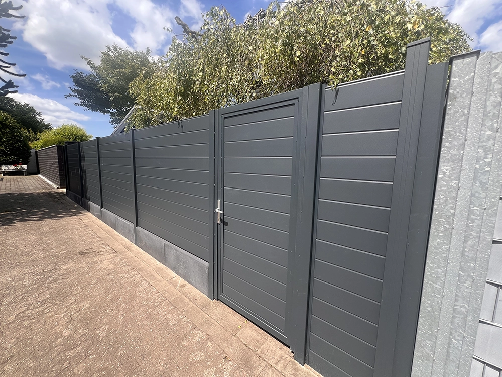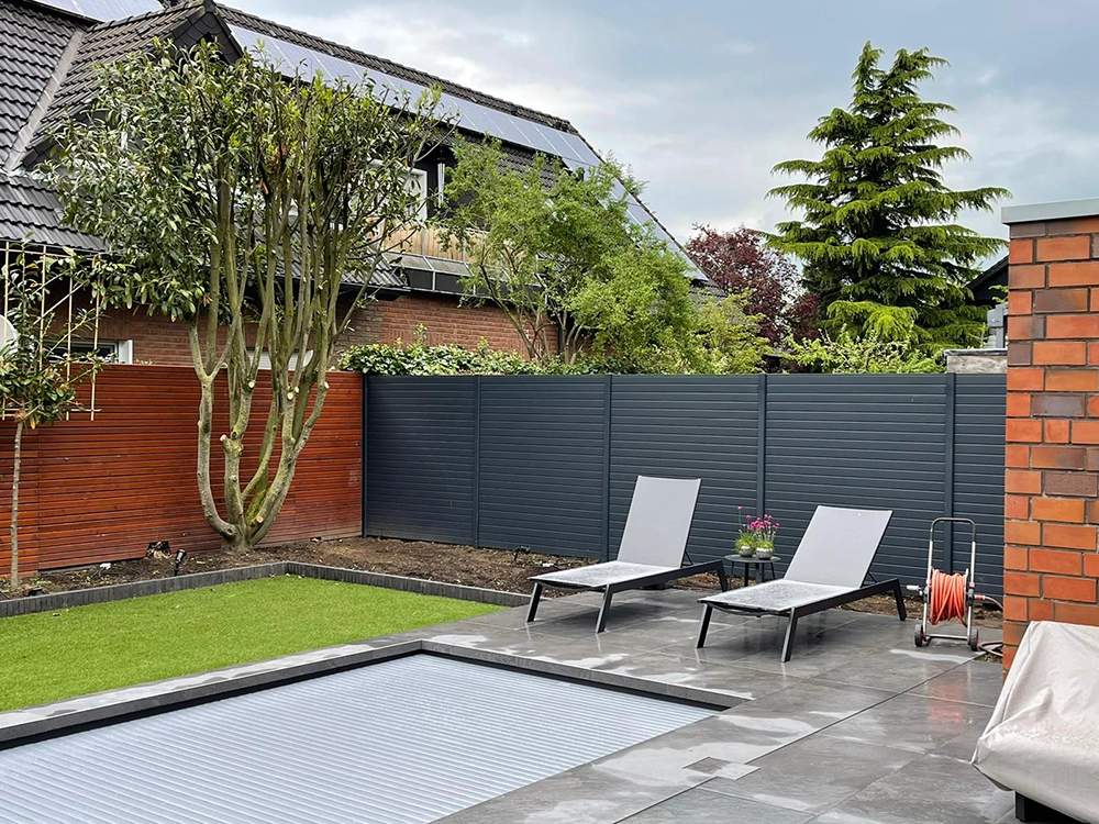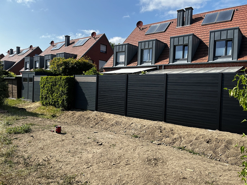 Auch als Sichtschutz ist Aluminium hervorragend geeignet. Geschlossene oder teilgeschlossene Paneele schaffen Privatsphäre in dicht besiedelten Wohngebieten, ohne den Garten optisch zu beschweren. Unterschiedliche Lamellenabstände, Höhen und Farbtöne ermöglichen eine individuelle Anpassung an Haus, Garten und Umgebung. So entsteht ein harmonisches Gesamtbild mit modernem Charakter.